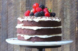 Naked Chocolate Cake with Buttercream Frosting: A triple layer Double Chocolate Cake with Buttercream Frosting topped with berries and chocolate shavings!