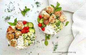 I am definitely on a Mediterranean food kick. I mean who can resist such delicious, healthy, flavorful food? Certainly not me. Today I am sharing a recipe for Greek Meatball and Tzatziki Rice Bowls. I LOVE this meal because it’s got everything: protein, healthy fats, vegetables, and a ton of flavor. It’s easy to make…
