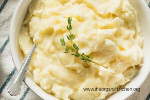 The Organic Kitchen Sweet Potato Casserole: Sweet potatoes whipped up with fresh pasture butter, real maple syrup with a hint of vanilla, all sprinkled with a crumbly pecan topping.