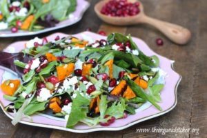 Greens with Roasted Sweet Potatoes and Pomegranate Seeds!