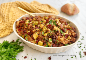 The Organic Kitchen Sweet Potato Casserole: Sweet potatoes whipped up with fresh pasture butter, real maple syrup with a hint of vanilla, all sprinkled with a crumbly pecan topping.