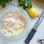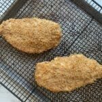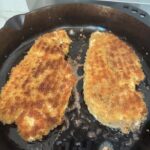 This recipe is made with two small/medium sized chicken breasts prepared as cutlets. Some stores carry prepared cutlets but you can also make your own. To make cutlets: slice the breast so it is half as thick as it was, place on a cutting board and cover with parchment paper or paper towel, pound with a rolling pin until the chicken is about 1/2″ thick. It’s important that the cutlets are about 1/2″ thick from end to end, this makes for even cooking with no areas being dry while others are undercooked.
