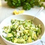 I top these crispy chicken cutlets with a lemony avocado and feta salad. This salad comes together in about five minutes. Simply dice avocado, thinly slice chives and combine in a bowl with feta and lemon juice, Yum!