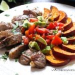 While the pork and sweet potatoes are lightly seasoned, the majority of the flavor in this meal is provided by the roasted red bell pepper salsa. This salsa is a combination of so many good things: Roasted red bell pepper, tomato, avocado, red onion, serrano chili, cilantro and lime juice!