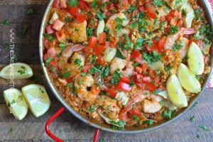 A delicious, fragrant, beautiful traditional Spanish dish, this Paella Valenciana with Chicken, Chorizo and Shrimp will definitely be a family favorite!