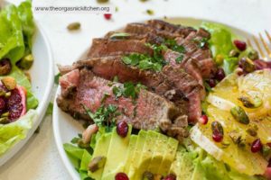 Tender Filet Mignon served with a delicious green salad with citrus and avocado! Paleo, Whole30 compliant.